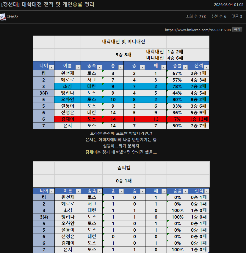 - 이전글헤로로, 김채이, 설둥이 경기는 진짜 정신력 문제임, 연습부족이 아니라니까 26.03.04