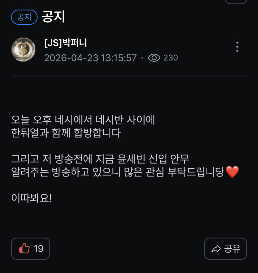 - 다음글오늘 합방 안나가길 잘했네 26.04.22