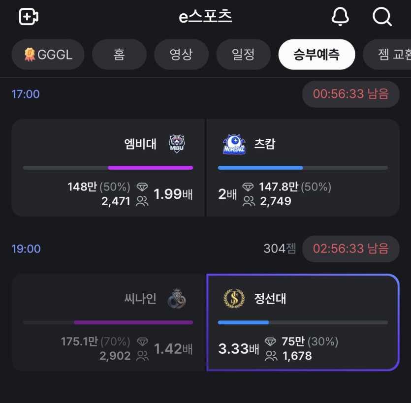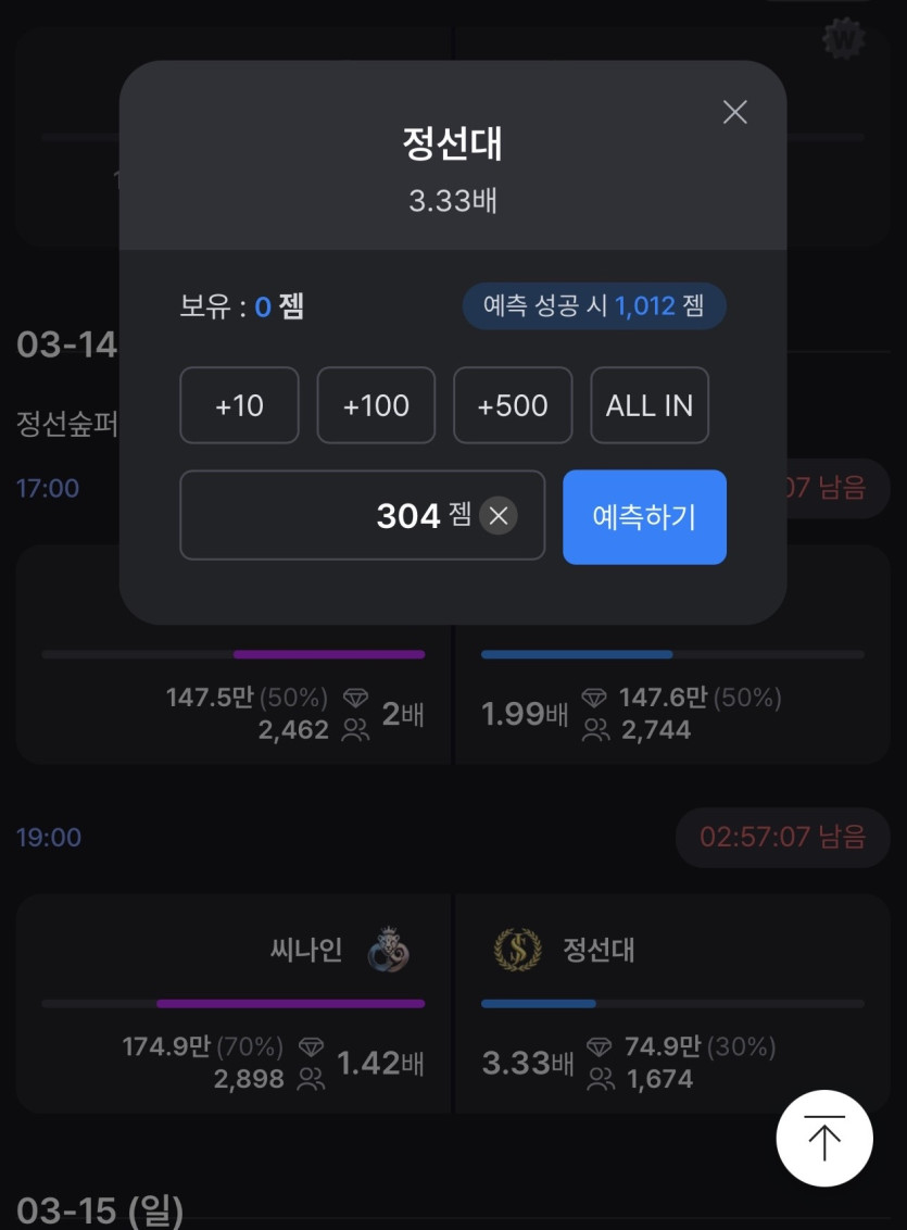 승부 예측은 정선대에 젬 올인 가겠습니다.