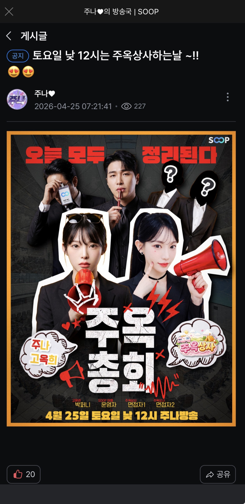 이따 주나♥님 방송으로 오후 12시 많은 관심 부탁드려용!