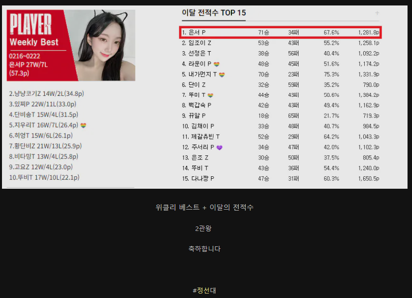 이달의 전적수 3위 선정은 10위 김채이