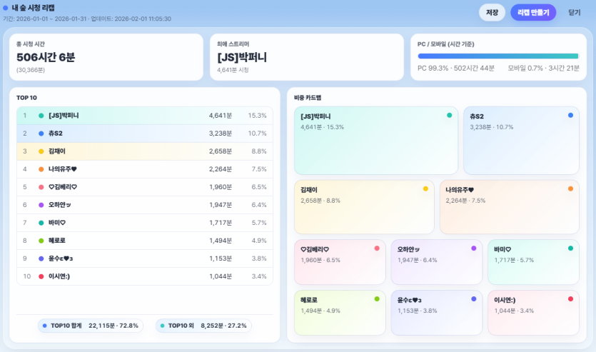 신년이라 첫 주랑 직급전 끝나고는 숲 거의 안봤는데도 앵간 찍혔네