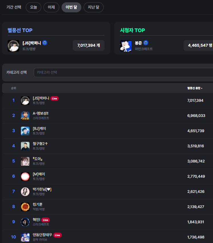 이번달 10일까지 현재 풍투순위
