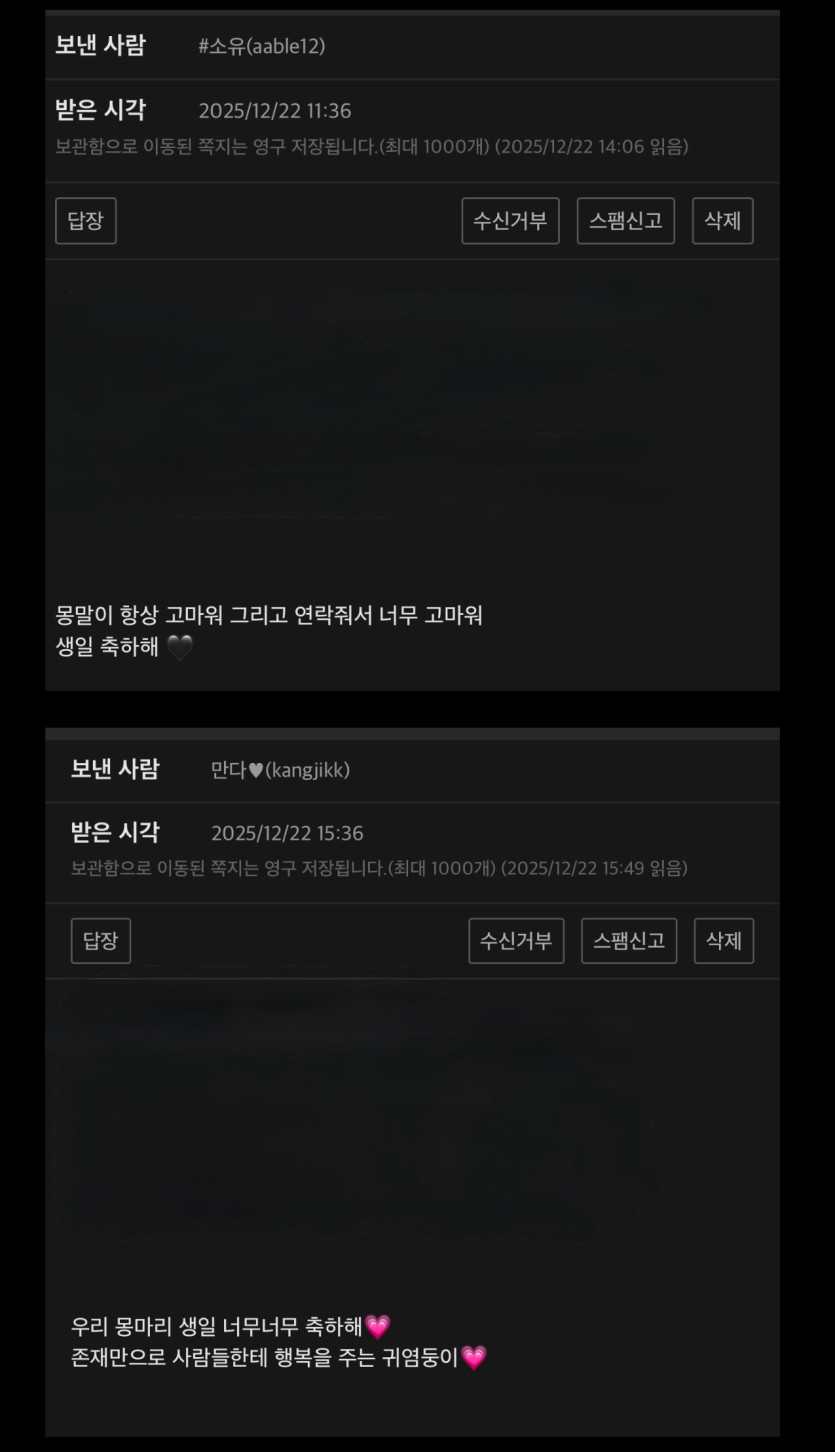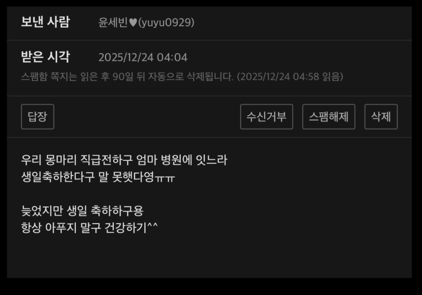 언제 복귀하냐고 물어 본 쪽지에 축하메시지도 보내주셔서